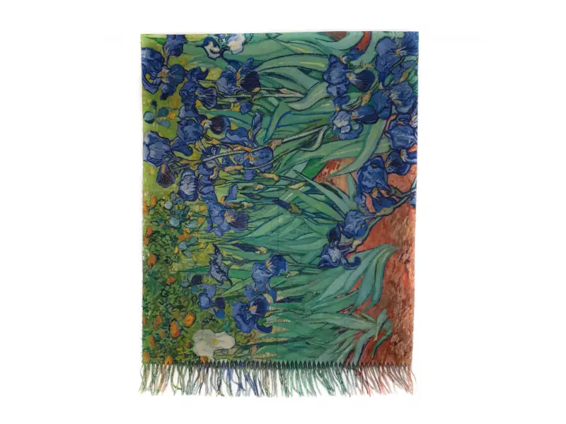 Шалът има двулицеви изображения на картините на Ван Гог - "Кафе тераса през нощта" и "Ириси".