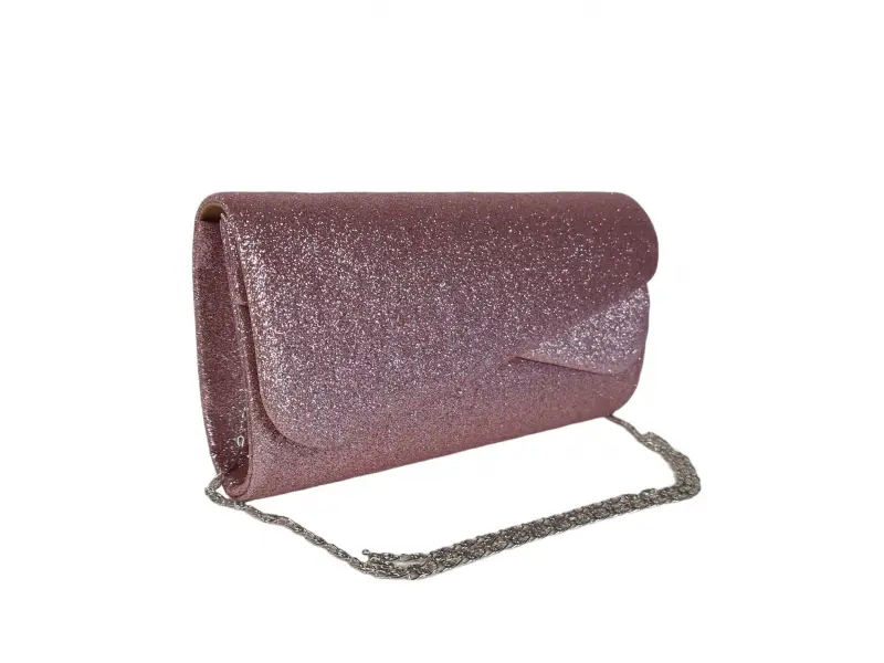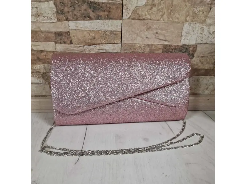 Блестяща розова дамска чанта - Официална дамска чанта с едно отделение. - Отваряне и затваряне с копче тип магнит. - Дълга дръжка тип верижка в сребърен цвят.