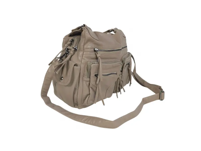 Качествена дамска чанта- Дамска чанта от варена кожа.- Две основни отделения с цип.- Малък вътрешен джоб с цип.- Отделения за телефон и документи.- Пет предни джоба с цип.- Заден джоб с цип.- Два странични джоба.- Удобни дръжки за носене.- Дълга регулираща се дръжка.