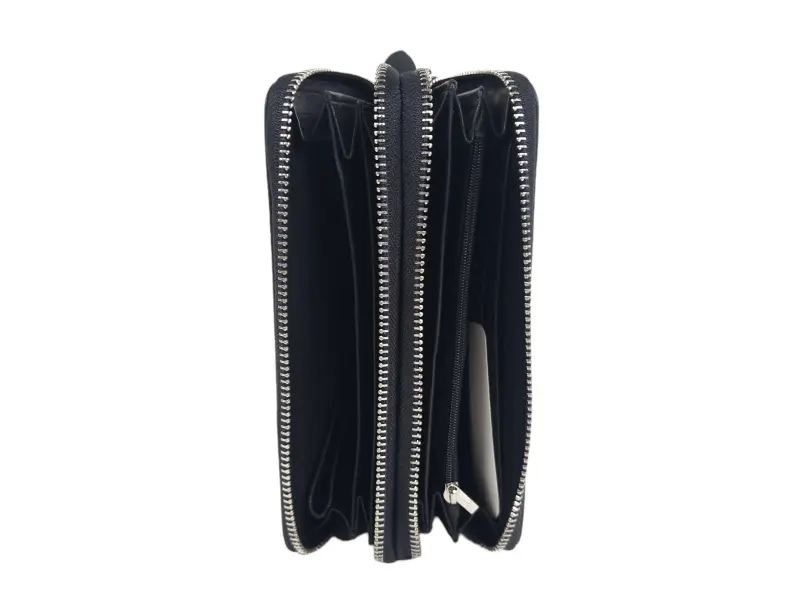 Портфейлът има отделение за банкноти, отделение за карти и лични документи, както и отделение за монети.