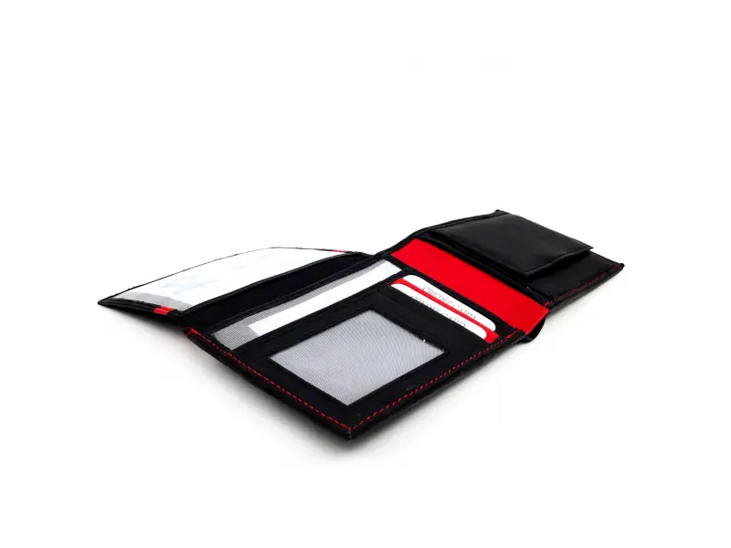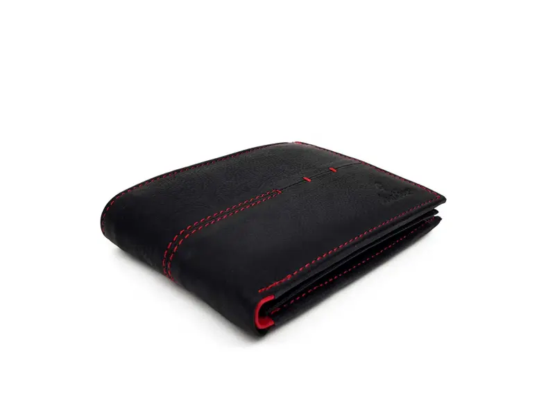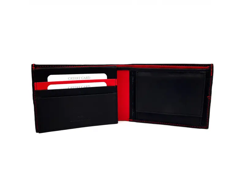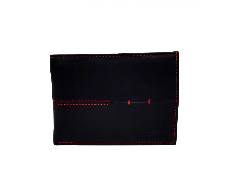 Невероятно качествен портфейл от естествена кожа в черен цвят с червен конец. Удобно разпределение за банкови карти , документи и визитник. Голямо портмоне с отделение за монети.