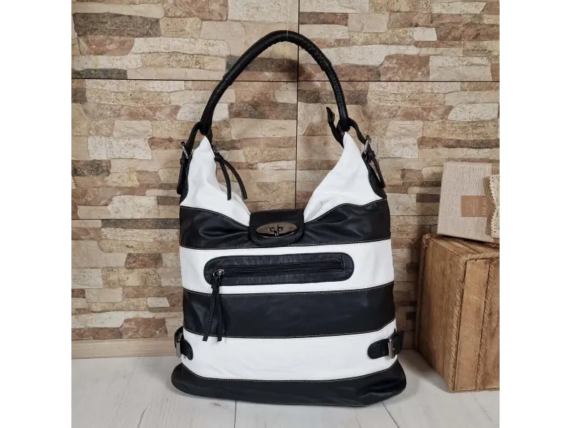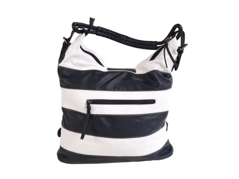 Черно-бяла дамска чанта - Дамска чанта от варена кожа. - Едно основно отделение с цип и с механизъм. - Малък вътрешен джоб с цип. - Отделения за телефон и документи. - Преден джоб с цип. - Заден джоб с цип. - Удобна регулираща се дръжка за носене.