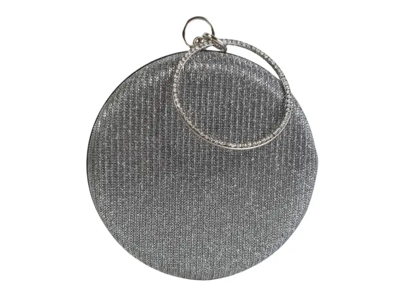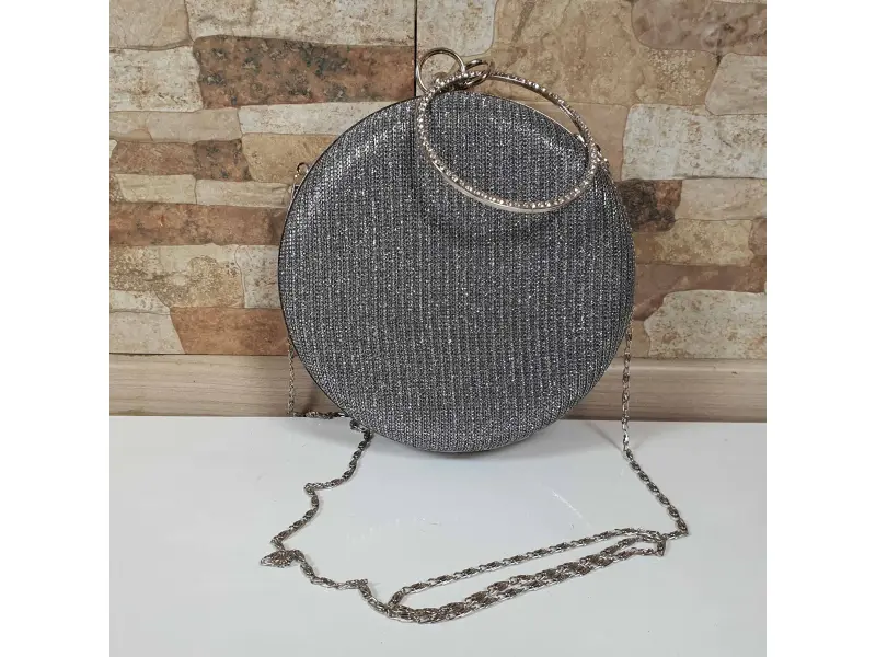 Стилна кръгла чанта с едно отделение с метален кант, дълга дръжка тип верижка и допълнителна дръжка за ръка. Елегантна чанта подходяща за абитуриентски бал, сватба или специално събитие.