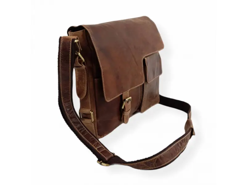 Качествена мъжка чанта от телешка естествена кожа, тип hunter. Мъжка голяма чанта с капак с магнитно закопчаване, вътрешна голяма предна преграда с цип, две предни джобчета, основно отделение с цип, вътрешно малко джобче с цип и отделение за ключове,телефон и химикали. Малък вътрешен портфейл от кожа и плат, заден джоб с цип и регулираща се дълга дръжка.