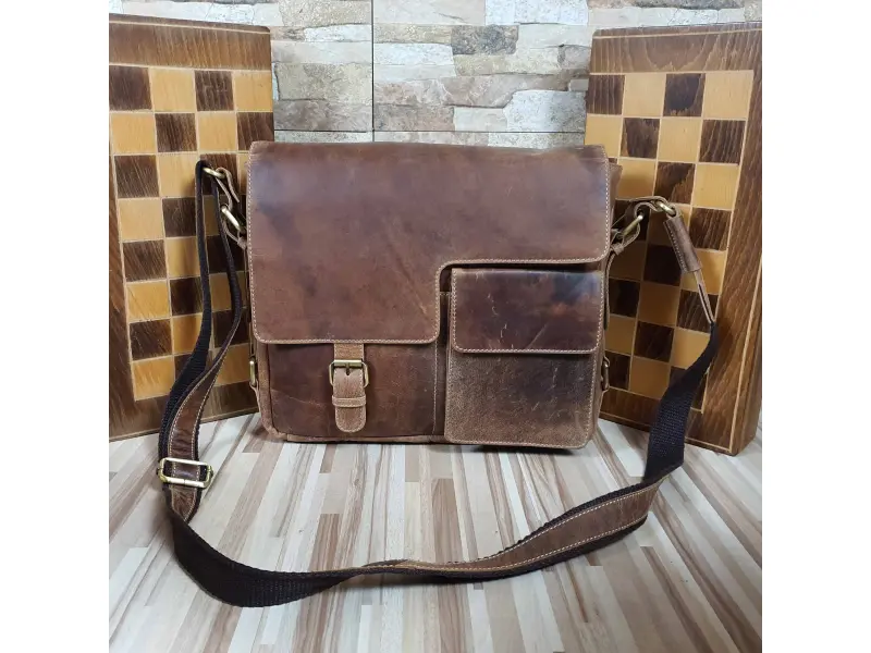 Качествена мъжка чанта от телешка естествена кожа, тип hunter. Мъжка голяма чанта с капак с магнитно закопчаване, вътрешна голяма предна преграда с цип, две предни джобчета, основно отделение с цип, вътрешно малко джобче с цип и отделение за ключове,телефон и химикали. Малък вътрешен портфейл от кожа и плат, заден джоб с цип и регулираща се дълга дръжка. Може да има малко разминаване в цветовете заради hunter ефекта.