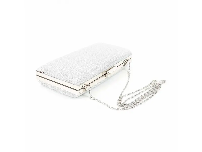 Сребърна чанта с едно отделение със сребърен кант и дълга дръжка тип верижка. Дамска чанта подходяща за абитуриентски бал, сватба или специално събитие.