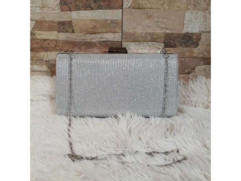 Голяма сребърна вечерна чанта. Голяма абитуриентска чанта със сребърен кант и верижка. Блестяща сребърна чанта подходяща за официално събитие - ePazar.bg