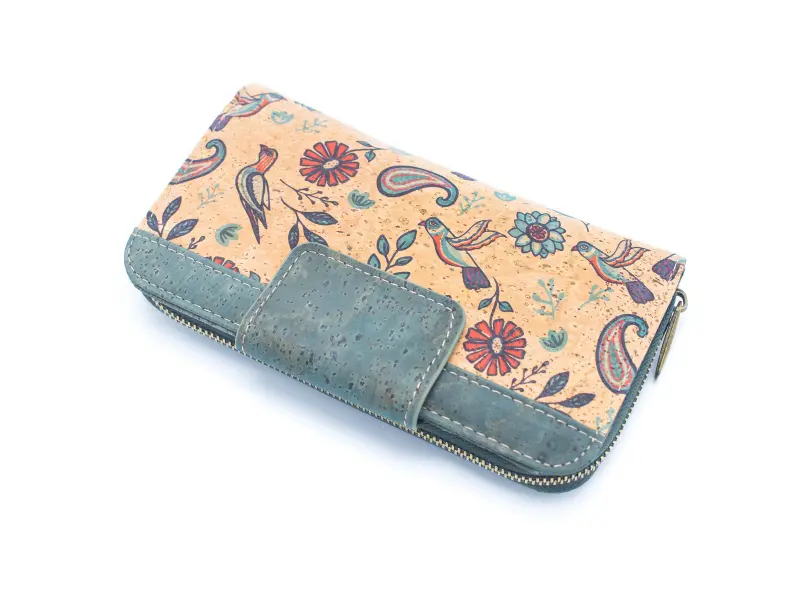 Качествено дамско портмоне от екологична материя - корк. Удобно дамско портмоне със закопчалка и външен монетник затварящ се с цип, преграда за монети и малък монетник с цип, много слотове за карти и документи и отделение за банкноти.