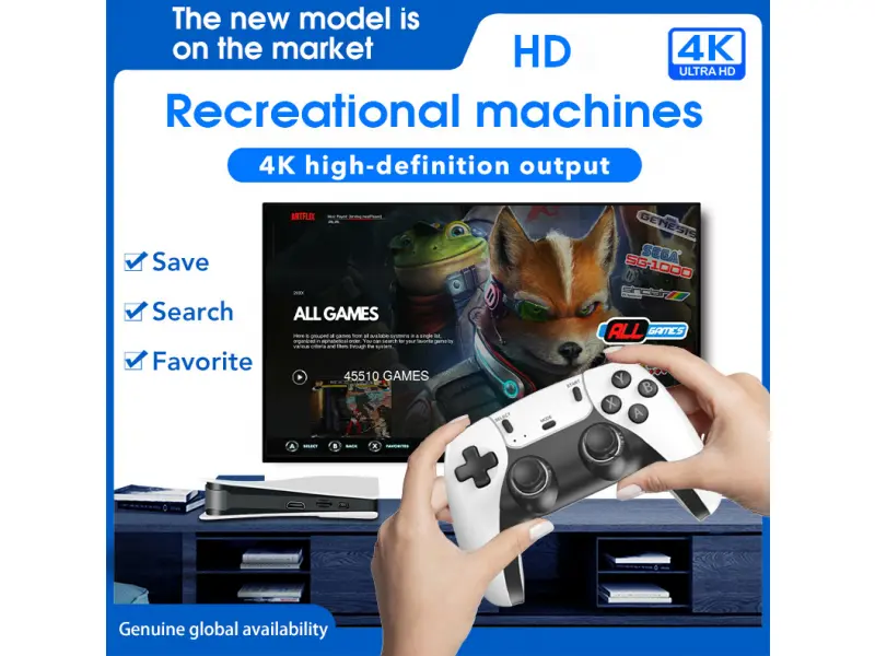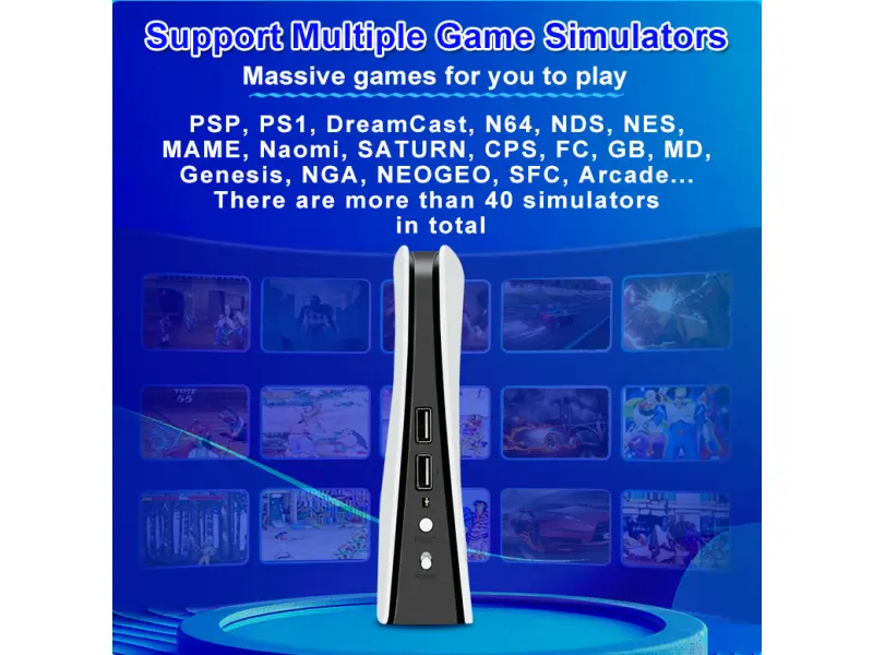 Устройството идва с 64GB microSD карта, вече заредена с над 46 000 игри от над 50 различни платформи – от PS1, PSP, NES, SNES, Sega, MAME, N64, DreamCast и още. Корпусът е минималистичен и здрав, а цялата система е олекотена и лесна за пренасяне – идеална за гости, пътувания или семейни събирания.