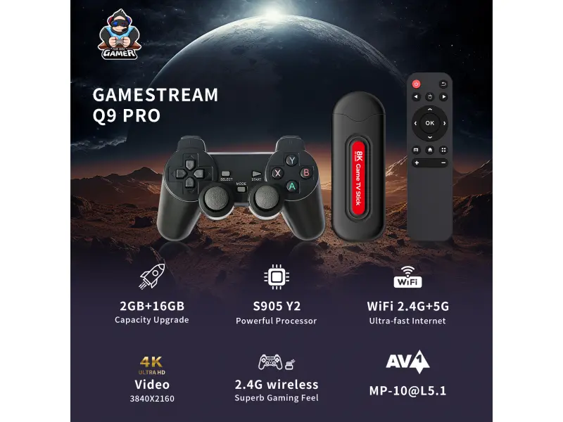 Game Stick + Android TV Q9Pro 4K не е просто още една ТВ приставка или ретро конзола. Това е иновативна двойна система, която съчетава най-новия Android 14.0 с мощна 3D GAME платформа. Външният вид е компактен и стилен – миниатюрен стик, който се побира в дланта ви, но крие в себе си истинска мултимедийна мощ. Изработен от здрави материали, с вграден WiFi 6 модул за максимално бърза и стабилна връзка,и HDMI 2.1 изход за кристално чиста 4K Ultra HD картина, този продукт е създаден за дълготрайна и надеждна употреба.