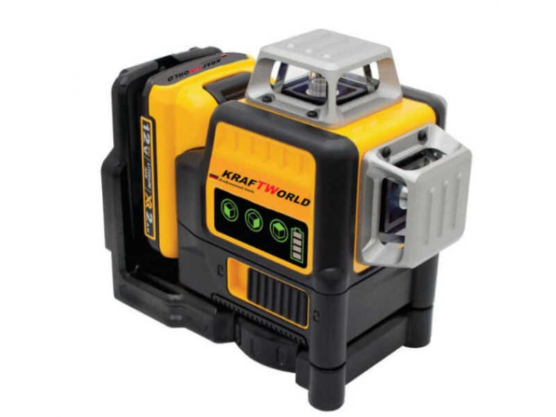 Нивелирът на KraftWorld е с 3 лъча самонивелиращ се, 360 ° линеен лазер кръстоска с ултра ярък зелен цвят. Зелени лазери са с 4 пъти по-видими за човешкото око, отколкото червени лазери от същата изходна мощност. Той също така има способността да проектира светли хоризонтални и вертикални линии на 360 °. Работи с 12V батерия. IP65 защита от прах и влага. Тестван при изпускане от 2 метра.