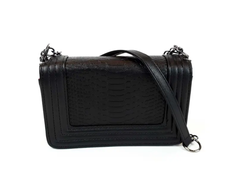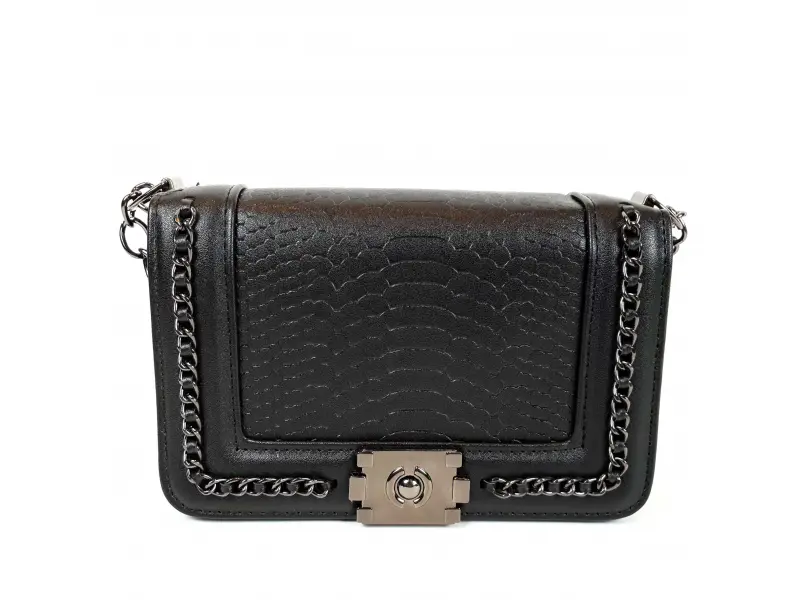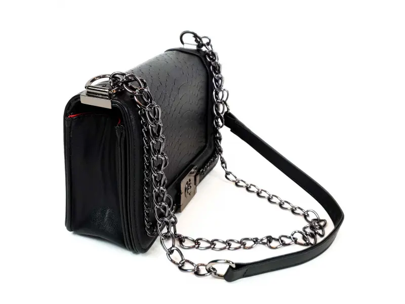 Стилна дамска чанта от качествена еко кожа в черен цвят. Дамска чанта с червена вътрешна подплата, едно отделение и малък джоб с цип. Чанта с дълга дръжка тип верижка с кожа за удобство. Интересна чанта отваряща се с механизъм.