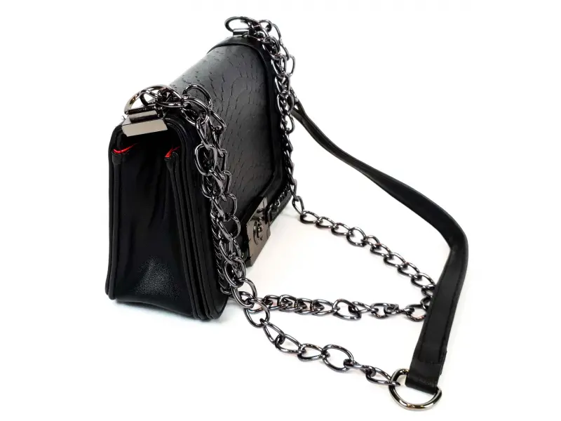 Стилна дамска чанта от качествена еко кожа в черен цвят. Дамска чанта с червена вътрешна подплата, едно отделение и малък джоб с цип. Чанта с дълга дръжка тип верижка с кожа за удобство. Интересна чанта отваряща се с механизъм.