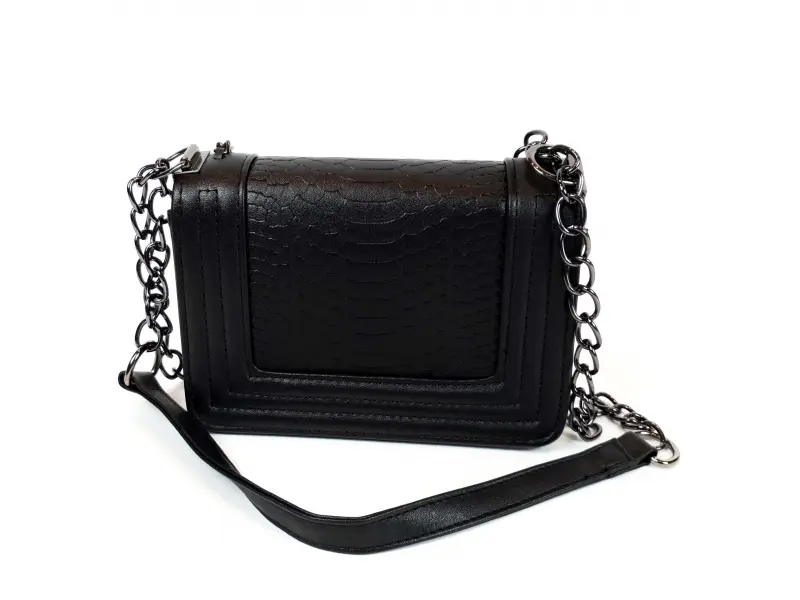 Интересна чанта - малък вариант. Стилна дамска чанта от качествена еко кожа в черен цвят. Чанта с дълга дръжка тип верижка с кожа за удобство. Интересна чанта отваряща се с механизъм.