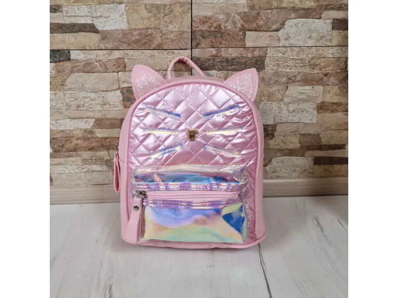 Качествена детска раница - коте внос от Гърция. Удобна, малка детска раница за момиче с прозрачно малко предно джобче, регулиращи се презрамки и дръжка за носене в ръка - ePazar.bg