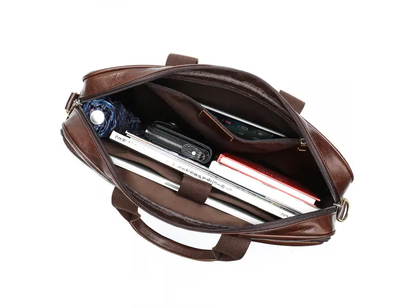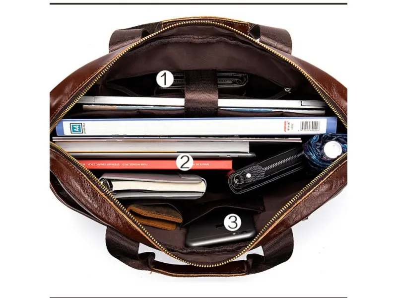 Мъжка чанта от специално обработена естествена кожа - Едно основно отделение с цип. - Отделение за лаптоп затварящо се с лепенки . - Вътрешен джоб с цип. - Преден джоб с цип. - Отделение за телефон. - Отделение за химикали и моливи. - Отделение за документи. - Заден джоб с цип. - Удобни дръжки за носене. - Дълга регулираща се дръжка.