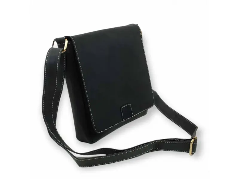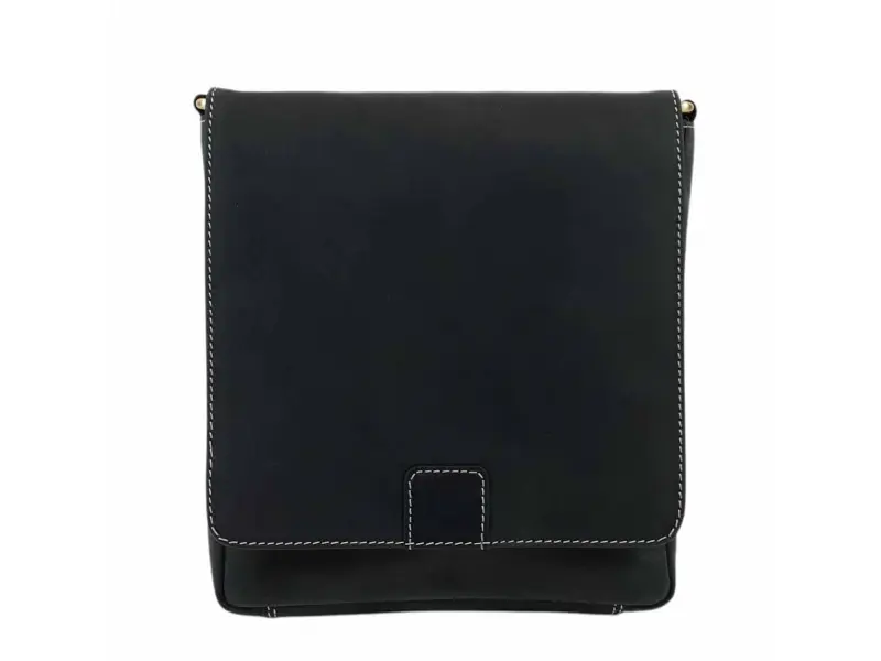 Качествена мъжка чанта от естествена телешка кожа със специална обработка - Hunter. Черна мъжка чанта с капак и магнитно закопчаване, едно основно отделение с цип, вътрешно малко джобче с цип, място за телефон, предно отделения и заден джоб с цип, регулираща се кожена дръжка.