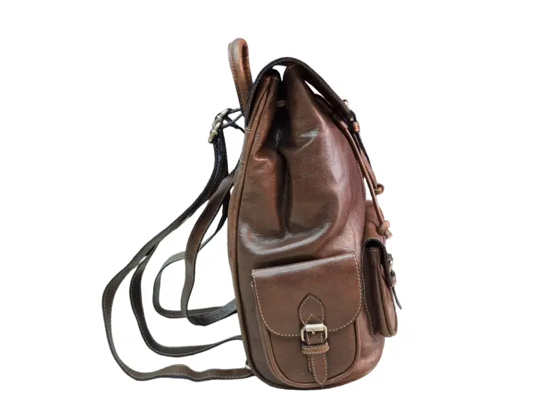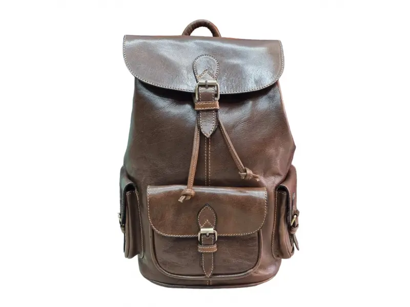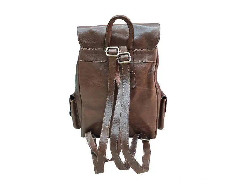 Кожена дамска раница в кафяв цвят от 100% натурална естествена кожа. Страхотен винтидж модел с едно голямо отделение пристягащо се с кожени връзки и капак с магнитно затваряне, един преден джоб и два странични джоба затварящи се с колан, вътрешен джоб с цип, вътрешен джоб без цип, регулиращи се дръжки от кожа и стабилна дръжка за носене в ръка.