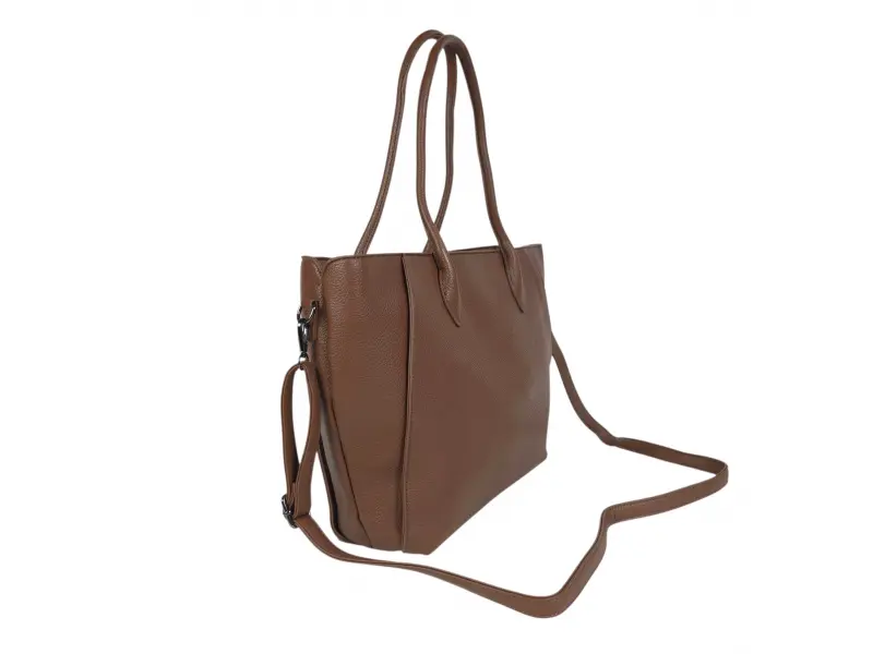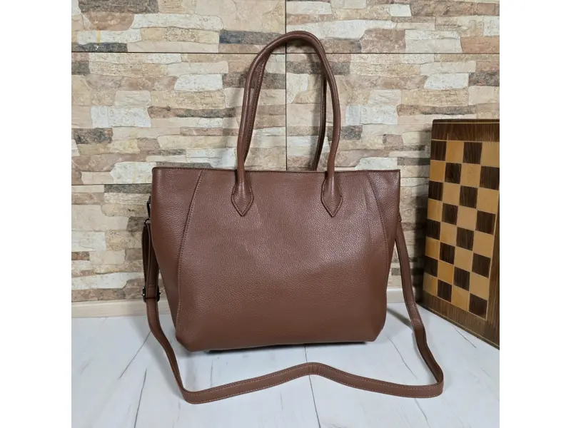 Дамска чанта в актуално кафяв цвят - Дамска чанта от еко кожа. - Едно основно отделение разделено на две от джоб с цип. - Малък вътрешен джоб с цип. - Отделение за телефон и ключове. - Заден джоб с цип. - Удобни дръжки. - Допълнителна дълга дръжка.