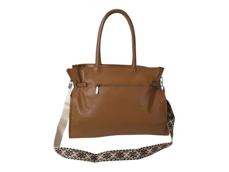 Кафява дамска чанта - Дамска чанта от еко кожа. - Едно отделение затварящо се с цип. - Вътрешна преграда с цип. - Място за телефон и ключове. - Вътрешно джобче с цип. - Вътрешно джобче без цип. - Задно джобче с цип. - Удобни презрамки. - Допълнителна дълга дръжка.