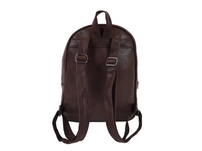 Кафява раница с удобно разпределение - Дамска раница от еко кожа. - Едно голямо отделение с цип. - Вътрешен джоб с цип. - Преден джоб затварящ се с цип. - Удобни регулиращи се презрамки.