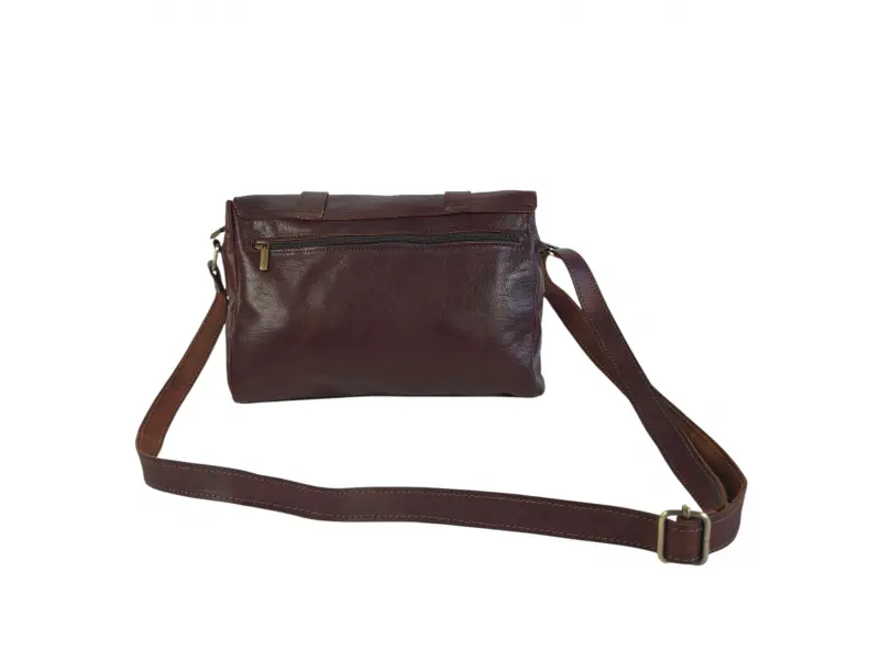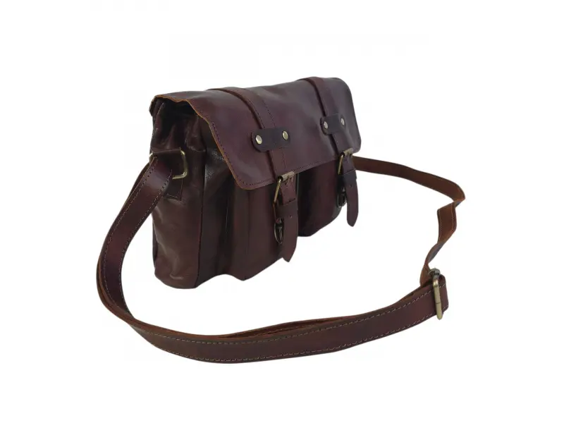 Качествена винтидж чанта - Мъжка чанта от естествена кожа. - Едно основно отделение с цип и затваряне с катарами и механизъм. - Вътрешна преграда с цип. - Преден джоб под капака с цип. - Два предни джоба под капака без цип. - Заден джоб с цип. - Дълга регулираща се дръжка.
