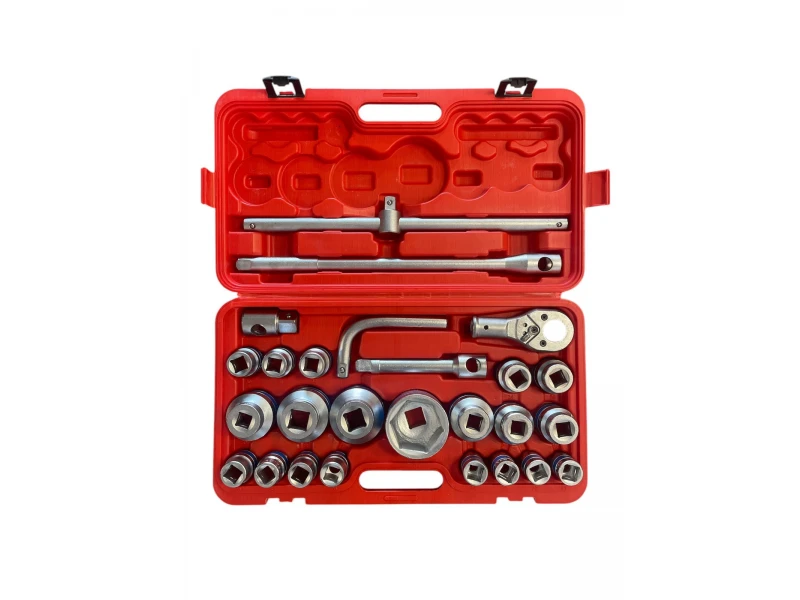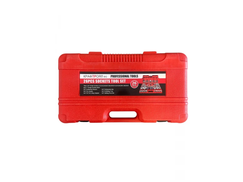 Комплект професионални ударни вложки 3/4" и 1" – 26 частиТози комплект съдържа висококачествени инструменти, изработени от устойчиви и надеждни материали, гарантиращи дълъг експлоатационен живот. Идеален за професионална употреба.Съдържание на комплекта:???? 20 броя вложки: 21, 22, 23, 24, 26, 27, 28, 29, 30, 31, 32, 34, 36, 38, 41, 46, 50, 55, 60, 65 мм ???? 2 броя удължители: 200 мм и 500 мм ???? 1 брой подвижна свръзка ???? 1 брой Т-образен върток: 520 мм ???? 1 брой адаптер: 3/4" и 1" ???? 1 брой тресчотка ???? Здрав куфар за съхранение и лесно пренасянеТегло на комплекта: 18,3 кгПодходящ за професионална и тежкотоварна работа!