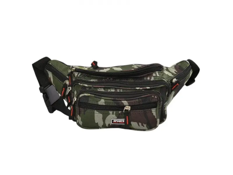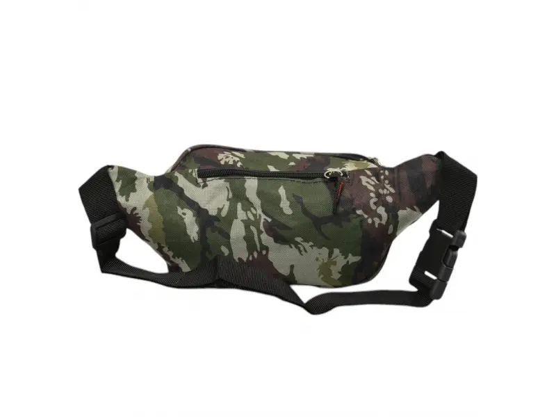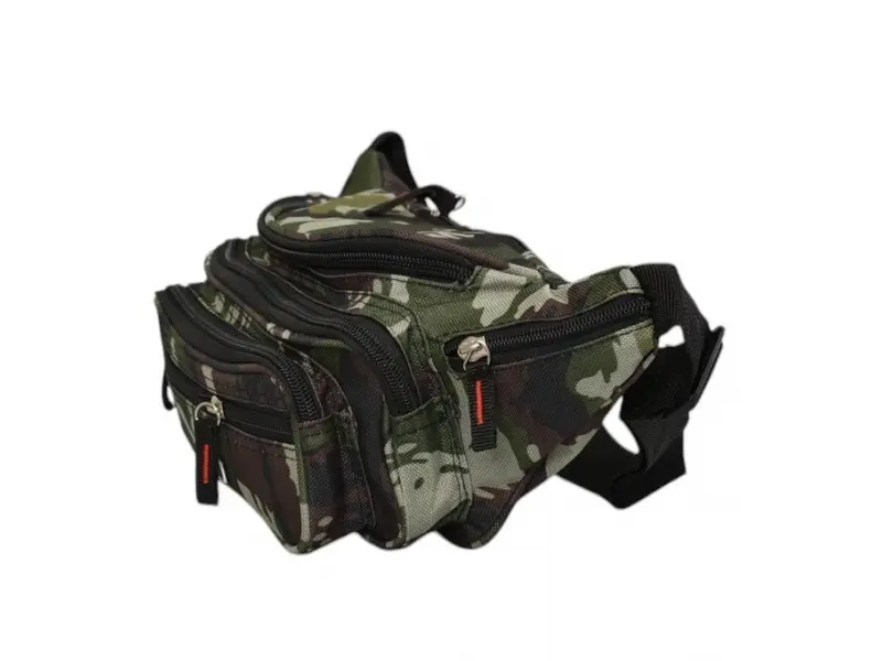 Камуфлажна чанта за през кръста от плат. Мъжка чанта с основно отделение с цип, три предни джоба с цип и заден джоб с цип, две странични джобчета с цип. Удобна мъжка чанта с регулиращ се колан от полиестер.
