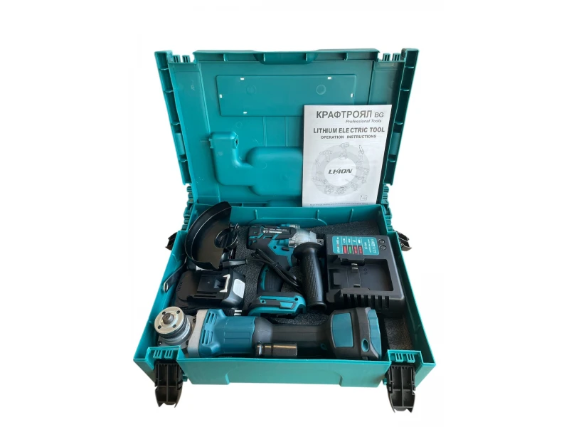 • Комплект акумулаторен безчетков ъглошлайф и акумулаторен гайковерт KraftRoyal