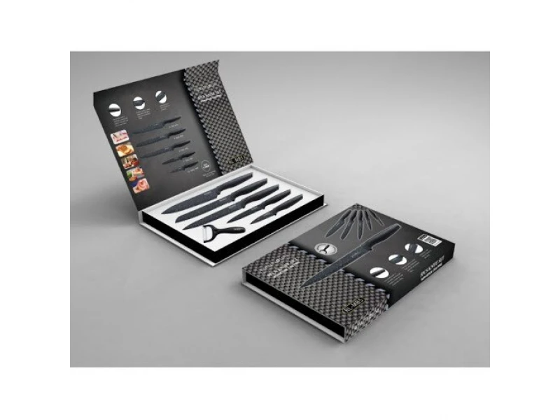 Комплектът включва:1 x Нож на готвач 8"1 x нож за рязане (за нарязване нагоре) 8"1 x 5" универсален нож1 x нож за белене 3,5 "1 x нож за хляб 8"1 x белачкаПредимства и ползи:√ НЕРЪЖДАЕМА СТОМАНА√ ЕРГОНОМИЧНА ПЛАСТМАСОВА ДРЪЖКА