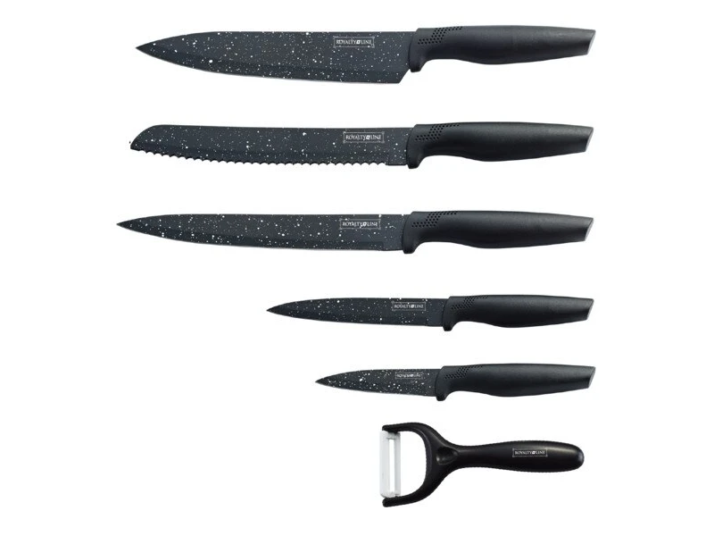 Уникален комплект нож и белачка Royalty Line RL-ML5B. Имат незалепващо мраморно покритие, което предпазва храната от залепване.