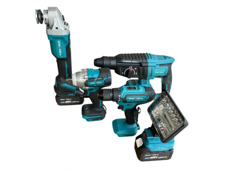 • Комплект от акумулаторен перфоратор, ъглошлайф, гайковерт, винтоверт и работна лампа  с 3 броя батерии 36V 8Ah и зарядно KraftRoyal