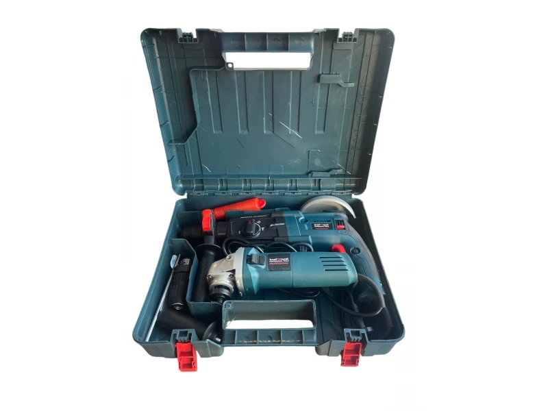 1.Немски Перфоратор-къртач KraftRoyal / пробивна бормашина, дрелкаИзключителна сила на удара с 3 J за висока производителност при снемане на материал.Oптимизиран ударен механизъм и дълъг живот благодарение на стабилната метална конструкция.Описание:– 3 режима на работа – пробиване , ударно пробиване , къртене– Със слаби вибрации при работа и празен ход– Леко притискане, за работа без умора– Вградена защита срещу прах– Сферична връзка на кабела– Променливо фиксиране на секача в 12 положения под различен ъгъл– Ръкохватка с покритие– Меко противоплъзгащо покритие на главната и допълнителната ръкохватка за сигурно хващане– Предпазен съединител– Широк плъзгащ превключвател за удобно включване и изключване– Въртяща се плоча с четкодържатели (за еднаква мощност при дясно и ляво въртене)– Втори сменяем патронник– Голям куфар за инструменти– Подходящ и за работещи с лявата ръкаХарактеристика:– Мощност 1600 W– Енергия на удара 0 – 3 J– Честота на ударите при номинални обороти 0 – 4.000 /мин– Номинални обороти 0 – 900 /мин– Захват на инструмента SDS-plus с вградена защита срещу прахДиапазон на пробиване:– Диаметър на отвора в бетон със свредло за перфоратори 4 – 26 мм– Оптимална област на приложение в бетон със свредло за перфоратори 8 – 16 мм– Максимален диаметър на отвора в зидария с корона за ядково пробиване 68 мм– Максимален диаметър на пробиване в стомана 13 мм– Максимален диаметър на отвора в дърво 30 ммФункции:– Безстепенно регулиране на оборотите– Дясно/ляво въртене2. Немски Ъглошлайф KraftRoyal 125 мм, 1100W, с регулация на оборотитеКомпактен ъглошлайф за работа с една ръка. Двигател с голяма производителност и стабилна изолация, за предпазване от агресивния прах. Лабиритна конструкция при уплътняванетоза предпазване на съчмените лагери. Възможност за подмяна на четките отвън. Електронен контрол за констант на оборотите. Плавен старт и заключване на шпиндела. Блокиране на шпиндела за лесна смяна на диска.Характеристика:– Диск 125 мм– Мощност 1100 W– Обороти без товар: 11 000 об./мин– Плавен старт– Регулиране на оборотите– Защита от претоварване