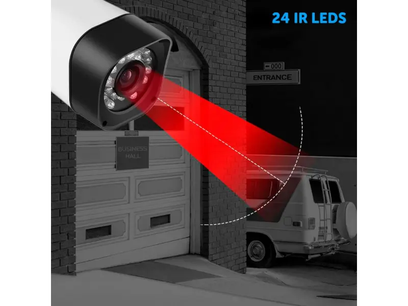 Всяка камера разполага с 24 IR светодиода, осигуряващи кристално чисто видео през нощта до 30 метра. Независимо от условията – дъжд, сняг или прах – водо- и прахоустойчивият дизайн гарантира безупречна работа.