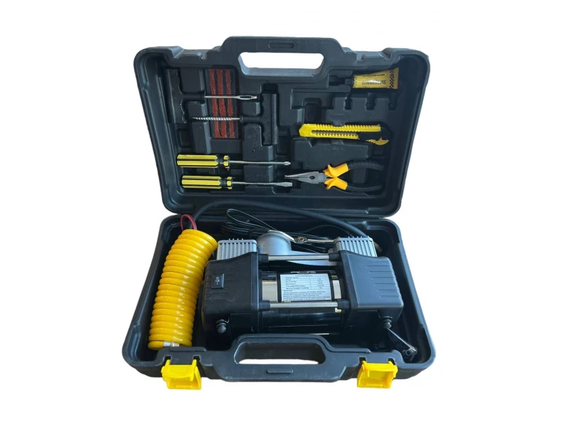 Този двуцилиндров компресор с мощен метален корпус и пълен комплект за ремонт на гуми е практично и надеждно решение както за ежедневна употреба, така и за спешни ситуации на пътя. Подходящ за автомобили, джипове и тежкотоварни МПС-та, както и за напомпване на различни надуваеми продукти - дюшеци, лодки, басейни, топки и други.