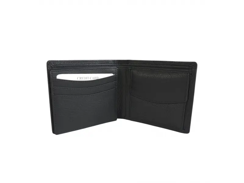 Кожен портфейл с удобно разпределение - Черен мъжки портфейл от естествена кожа. - Отделение за банкноти. - Слотове за карти и лични документи. - Отделение за монети.
