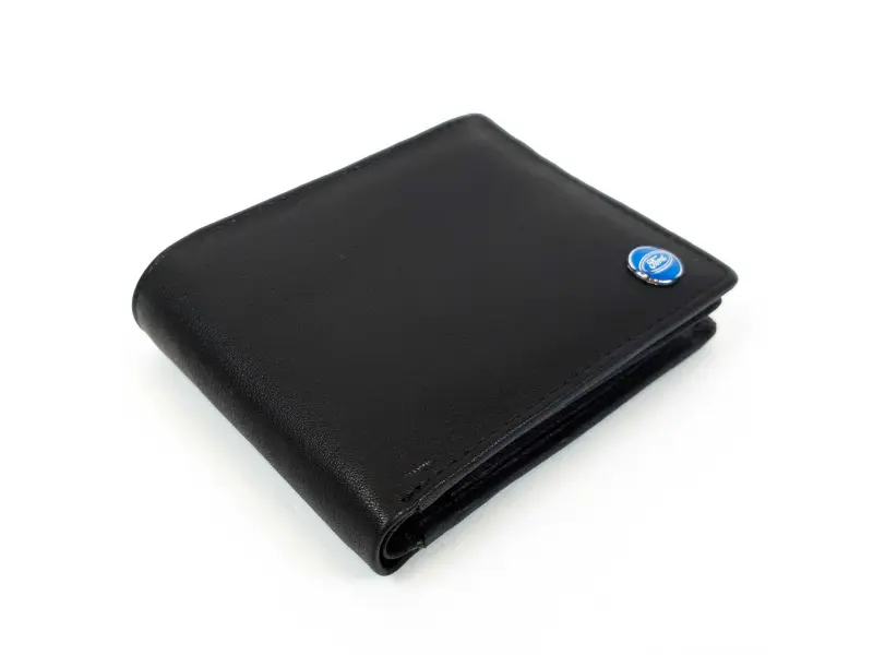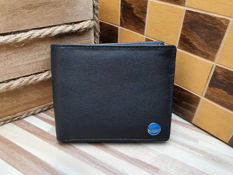 Мъжки кожен портфейл от мека на допир естествена кожа с логото на Форд. Черен портфейл с удобно разпределение за документи, карти, визитки, монети и банкноти.