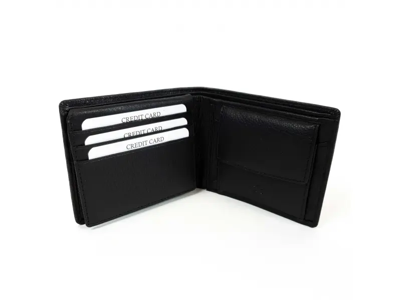 Портфейлът има отделения за документи, карти, визитки, монети и банкноти.