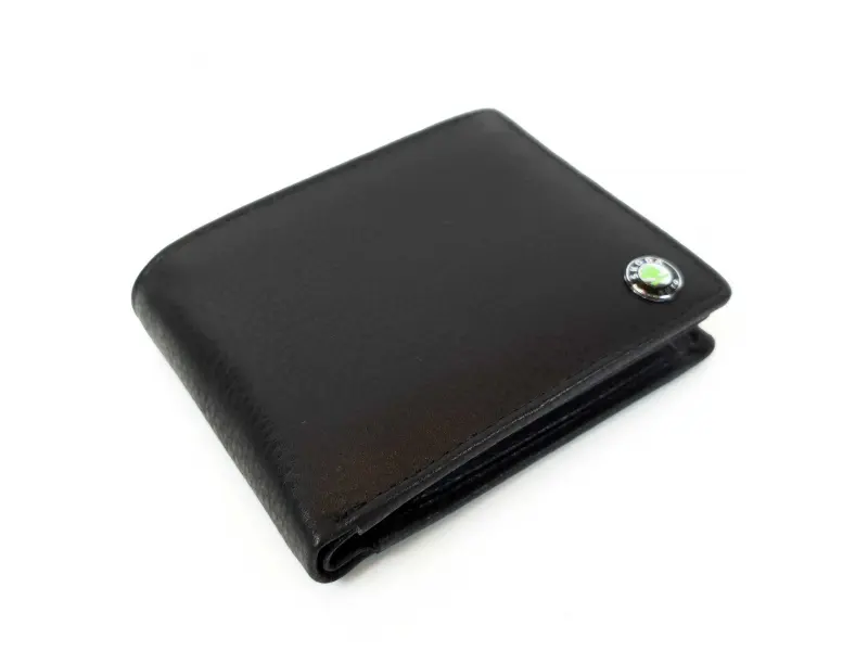 Мъжки кожен портфейл от мека на допир естествена кожа с логото на Шкода. Черен портфейл с удобно разпределение за документи, карти, визитки, монети и банкноти.