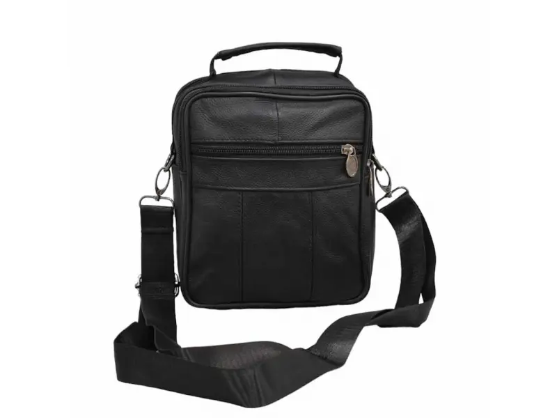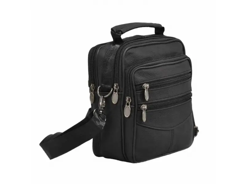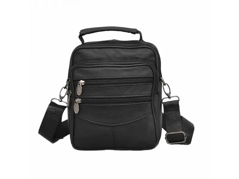Ежедневна мъжка чанта от кожа - Две основни отделения с цип. - Малък вътрешен джоб с цип. - Три предни джоба с цип. - Заден джоб с цип. - Регулираща се презрамка. - Дръжка за носене в ръка.