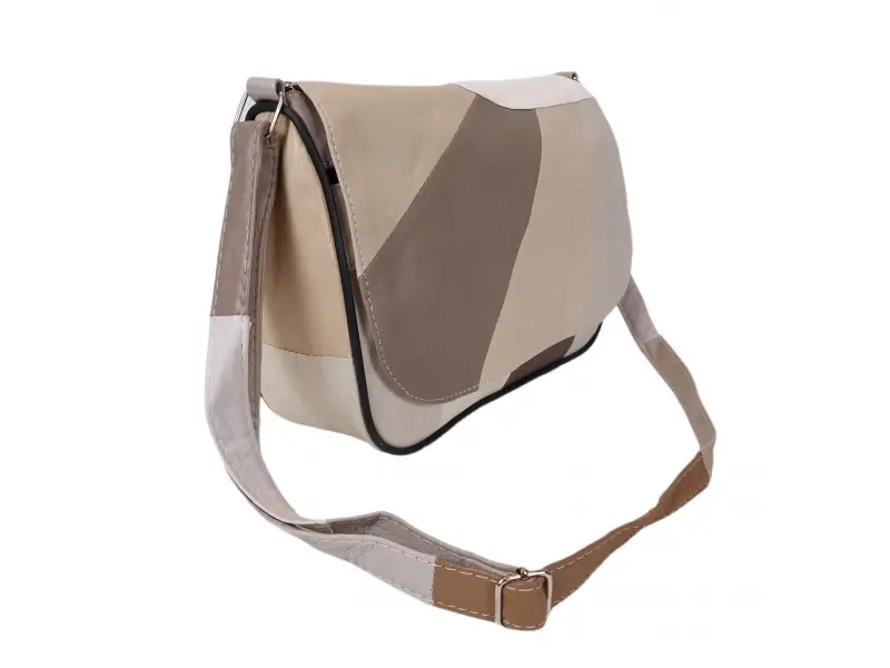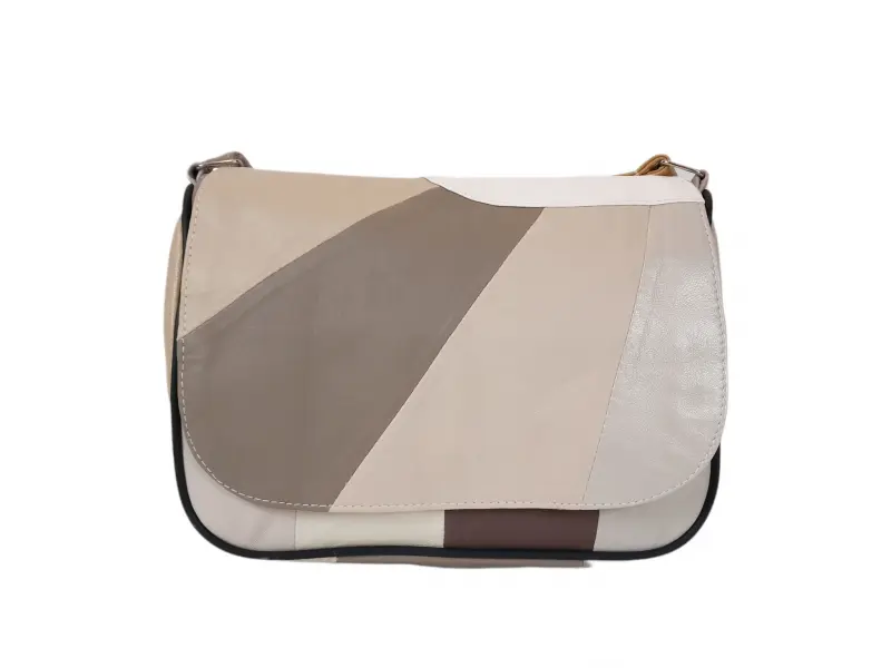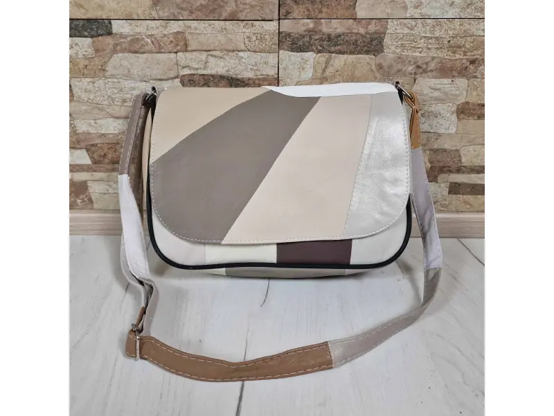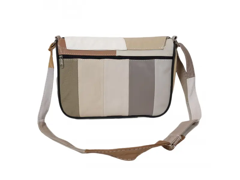 Качествена дамска чанта от агнешка естествена кожа. Многоцветна чанта с едно основно отделение с цип и магнитно закопчаване, малко вътрешно джобче с цип, джоб под капака с цип и заден джоб с цип. Удобна чанта с удобна дълга регулираща се дръжка.