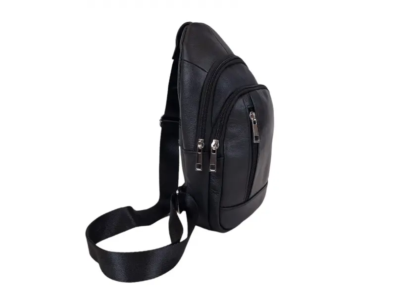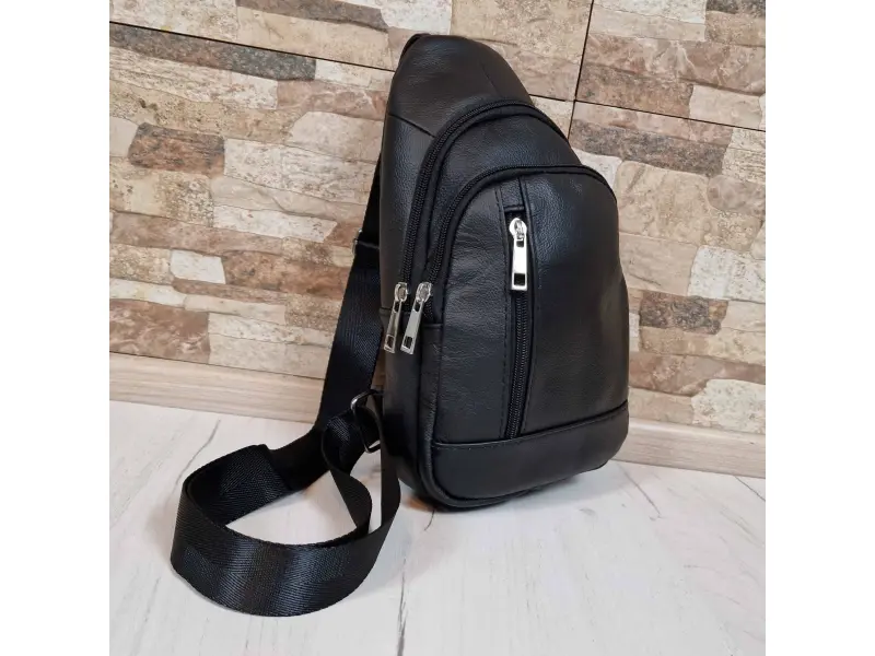 Удобна мъжка чанта Мъжка чанта за през гърди от естествена кожа. Черна мъжка чанта, която може да се носи през гърди, рамо или гръб тип раница. Мъжка чанта с едно основно отделение с цип, малко вътрешно джобче без цип, два предни джоба с цип заден джоб с цип, удобна регулираща се презрамка.