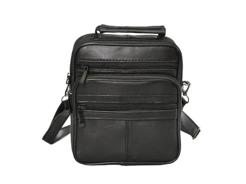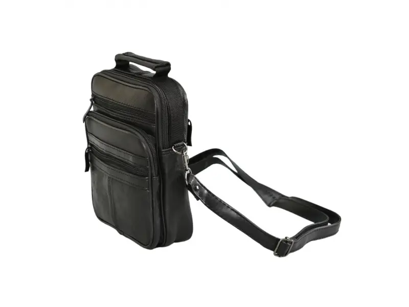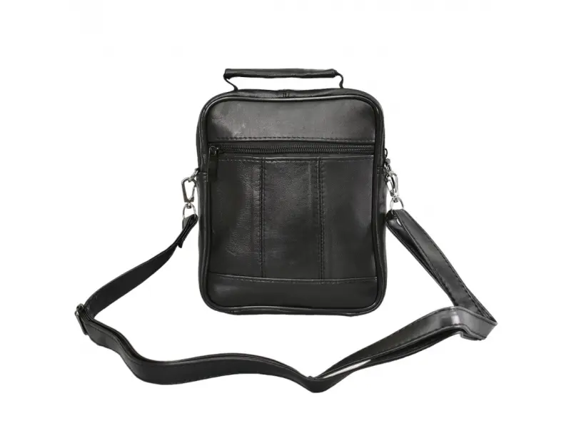 Мъжка малка чанта от естествена кожа - Едно основно отделение с цип. - Малък вътрешен джоб с цип. - Три предни джоба с цип. - Заден джоб с цип. - Регулираща се презрамка. - Дръжка за носене в ръка.