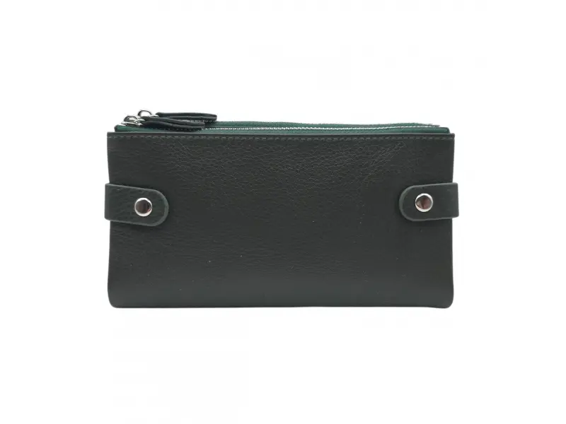 Маслено зелено дамско портмоне с два ципа - Дамско портмоне от естествена кожа. - Закопчаване с копчета тик-так. - Отделения за карти. - Отделения за банкноти. - Два джоба с цип.