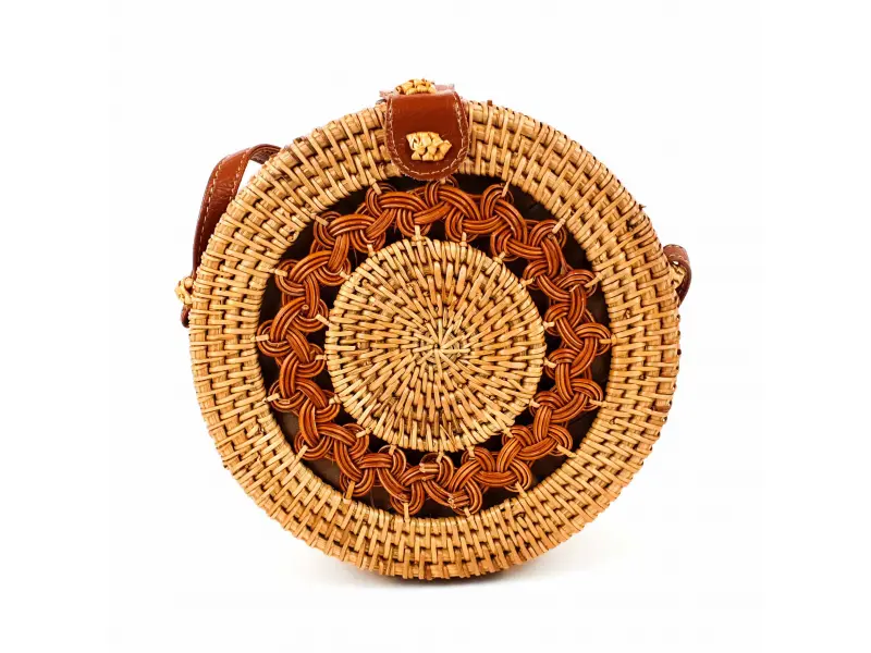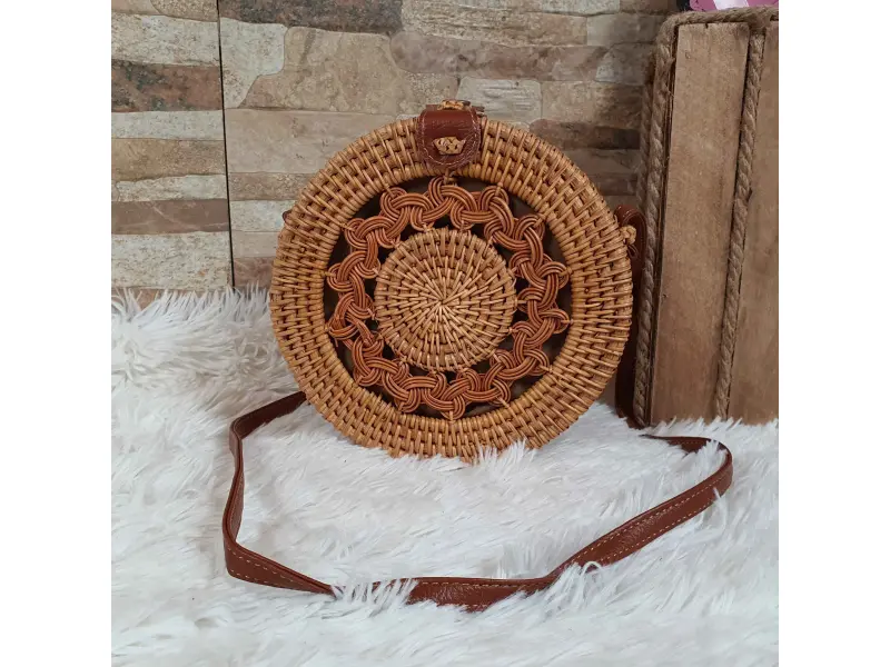 Уникален модел дамска чанта в кръгла форма. Ръчно изработена дамска чанта от ратан с едно голямо отделение, което се затваря с копче и дълга дръжка от кафява еко кожа.