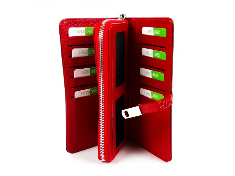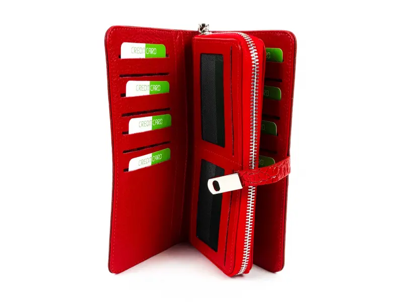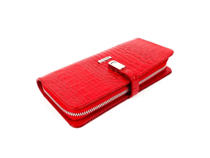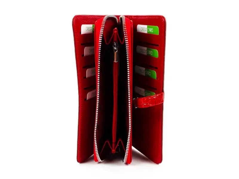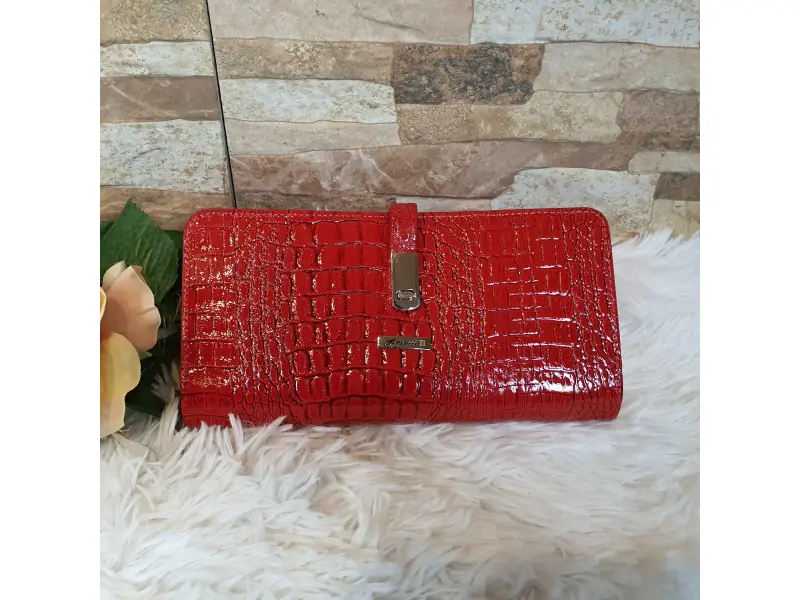 Качествено дамско портмоне от телешка, естествена кожа и лак. Червено дамско портмоне с магнитно закопчаване, удобно вътрешно разпределение за банкноти, карти и документи, отделение с цип и вътрешен монетник с цип.