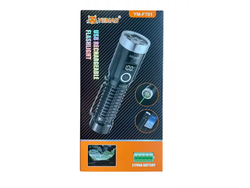 ✅ Фенер YEMAO YM-F701 – 7 LED диода + зелен лазер, висока яркост, USB зареждане 🔦🟢⚡ YEMAO YM-F701 е мощен и издръжлив фенер, подходящ за къмпинг, риболов, лов, разходки, охрана и аварийни ситуации . Отличава се с висока яркост , 7 LED диода и допълнителен зелен лазер , който е удобен за ориентация и сигнализация.✅ Основни предимства ✔️ Корпус от алуминиева сплав – здрав и надежден ✔️ Устойчив на износване и хлъзгане – стабилен захват ✔️ Висока яркост – силно осветяване в тъмни условия ✔️ 7 LED диода + зелен лазер – силна светлина + допълнителна функция ✔️ Литиева батерия 121700A – дълъг живот на батерията ✔️ Зареждане през USB – удобно и лесно ✔️ USB изход – може да се използва като PowerBank🔋 Батерия + контрол на заряда Фенерът работи с батерия 21700A , която осигурява продължителна работа и е подходяща за дълги излети и нощни приключения. 📊 Моделът разполага и с дигитален дисплей , който показва оставащия заряд, за да знаеш винаги колко батерия ти остава.🎒 Идеален за всяко приключение Независимо дали си на къмпинг, в планината или просто ти трябва надеждно осветление у дома – YEMAO YM-F701 е отличен избор, защото е лек, здрав и практичен , а USB зареждането го прави удобен навсякъде. ✅ Перфектен за къмпинг и палатка ✅ Подходящ за тъмни пътеки и преходи ✅ Полезен при аварии и липса на ток