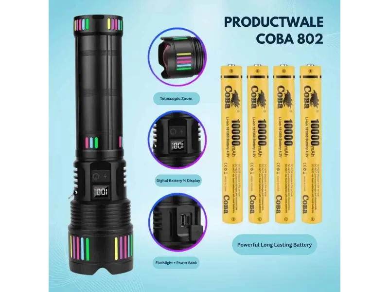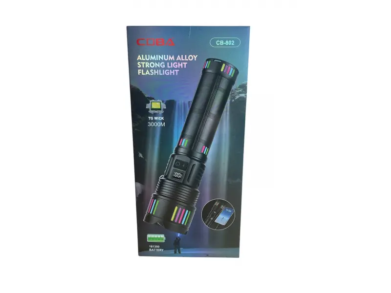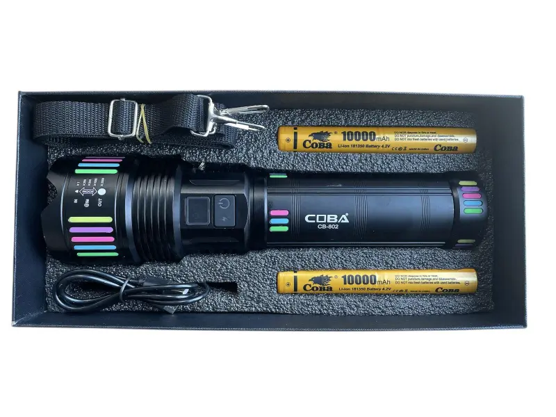 COBA CB-802 е мощен професионален фенер с екстремен обхват , създаден за ситуации, в които обикновените фенери не са достатъчни. Подходящ е за лов, къмпинг, охрана, преходи, аварийни ситуации и работа на открито , като предлага силен и концентриран лъч, прибиращ се zoom и огромен капацитет на батерията.
