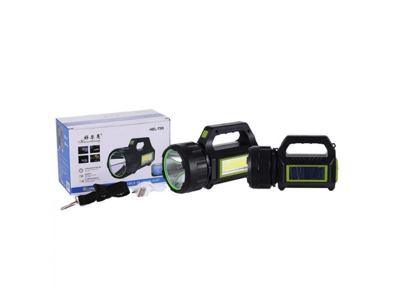 Представяме Ви Акумулаторен фенер HEL-T95 със супер мощен лед диод 10W T6 CREE и работно разстояние до 500м.Вградения соларен панел го прави изключително практичен и удобен при при къмпингуване и разходки нощно време в гората, за лов и риболов и много други случаи.Устройството има вградена странична светлина с три режима: слаб 50% и силен 100% и червена SOS светлинаЛед фенера е изграден от качествен корпус и е много удобен за работа. Вградената акумулаторна батерия му позволява безпроблемна работа.В задната част има изведен USB извод за зареждане на различни устройства на 5V – телефони /GSM/, таблети, MP3 плеари и др.Характеристика:Модел – HEL-T95;Батерия- Li-on 20000mahLED диод – 10 W, Т6 CREE;Вградена акумулаторна батерия;Здрав  корпус;Кристален отражател с диаметър 105 mm, осигуряващ светлинен лъч 2000 lm;Размери – 190мм/130мм/80мм;Време на зареждане –  до 12 h;Време на непрекъсната работа- до 16 h;Три режима на работа – 50%, 100%, мигащ червен (SOS).Включено в комплекта:1бр. led прожектор1бр. usb кабел за зареждане1бр. дръжка за носенеАко прожектора се ползва рядко, се препоръчва зареждане поне на 3 месеца веднъж, за удължаване живота на батерията.Не презареждайте за повече от 24 часа прожектора
