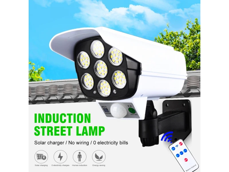 LED Соларна Лампа тип Камера е мощна лампа за стенен монтаж със вграден соларен панел. Нагласете според желания ъгъл, управлявайте с дистанционното и стреснете нарушителите! Мощност 180W с 77 LED диода. Перфектен за градински двор, тревна площ, вътрешен двор, гараж, веранда, алея. Направете живота си по-удобен и осветен!